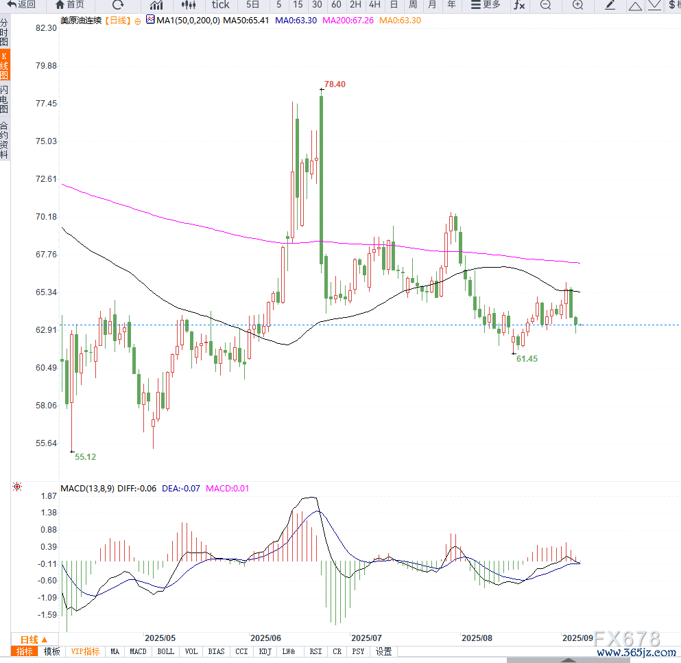 从好意思原油近30日日线图来看,价钱举座保管在63好意思元隔邻震憾,短期呈现蔼然下行趋势。图中7日均线有下穿14日均线的迹象,露馅出市集短期偏空信号。